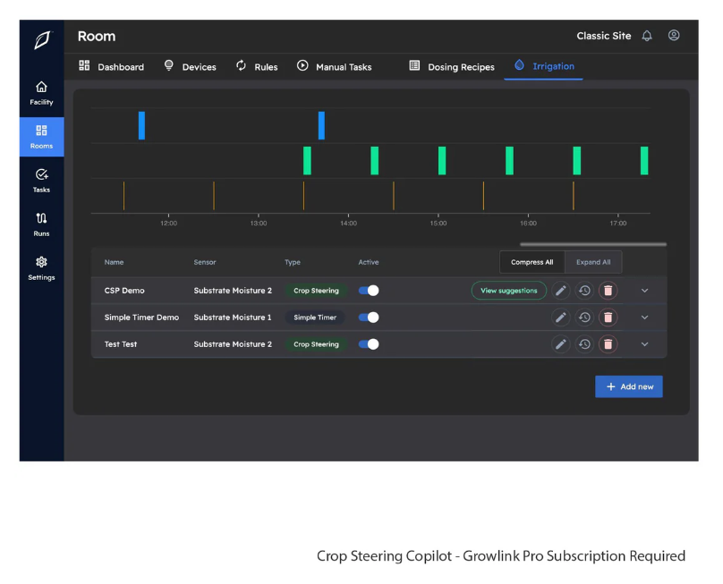 Optimize your cultivation with precision: Introducing the ultimate automation in irrigation management. Our AI-driven crop steering program, a first in the market, empowers you to automate your irrigation effortlessly. Utilize sensor triggers, timers, and schedules to ensure your crops receive exactly what they need, when they need it. Elevate your agriculture technology and put your irrigation on autopilot. Experience unparalleled efficiency and productivity.