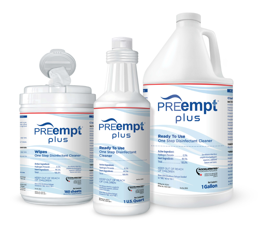 PREempt® Plus is a formulation of Accelerated Hydrogen Peroxide® (AHP®) that features faster kill times and lower residue. PREempt Plus is a ready-to-use, one-step broad-spectrum cleaner, and disinfectant designed for cleaning and disinfecting hard, non-porous surfaces.