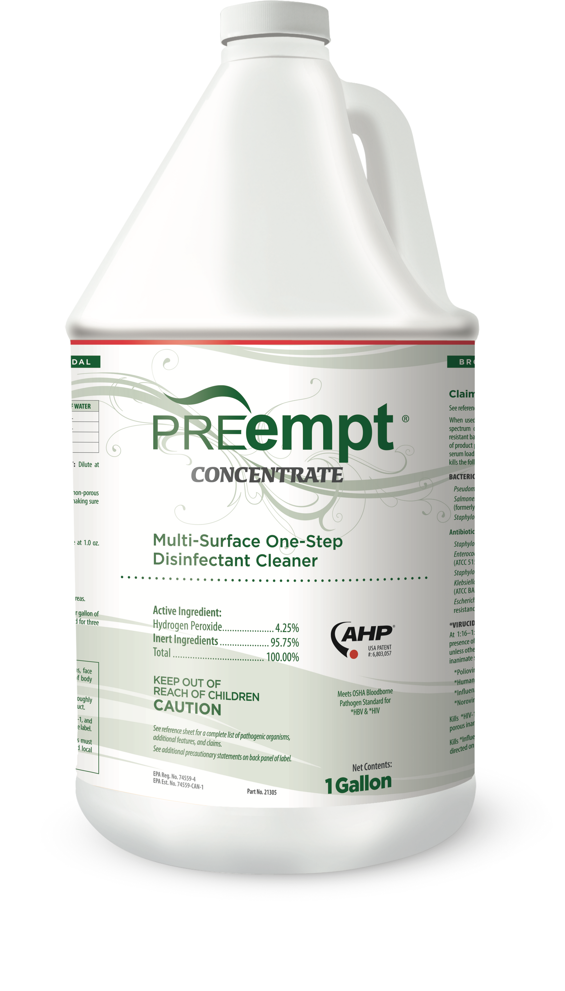 PREempt Concentrate utilizes Accelerated Hydrogen Peroxide®, a patented and synergistic blend of commonly used ingredients, that when combined with low levels of hydrogen peroxide dramatically increase its efficacy and cleaning performance.