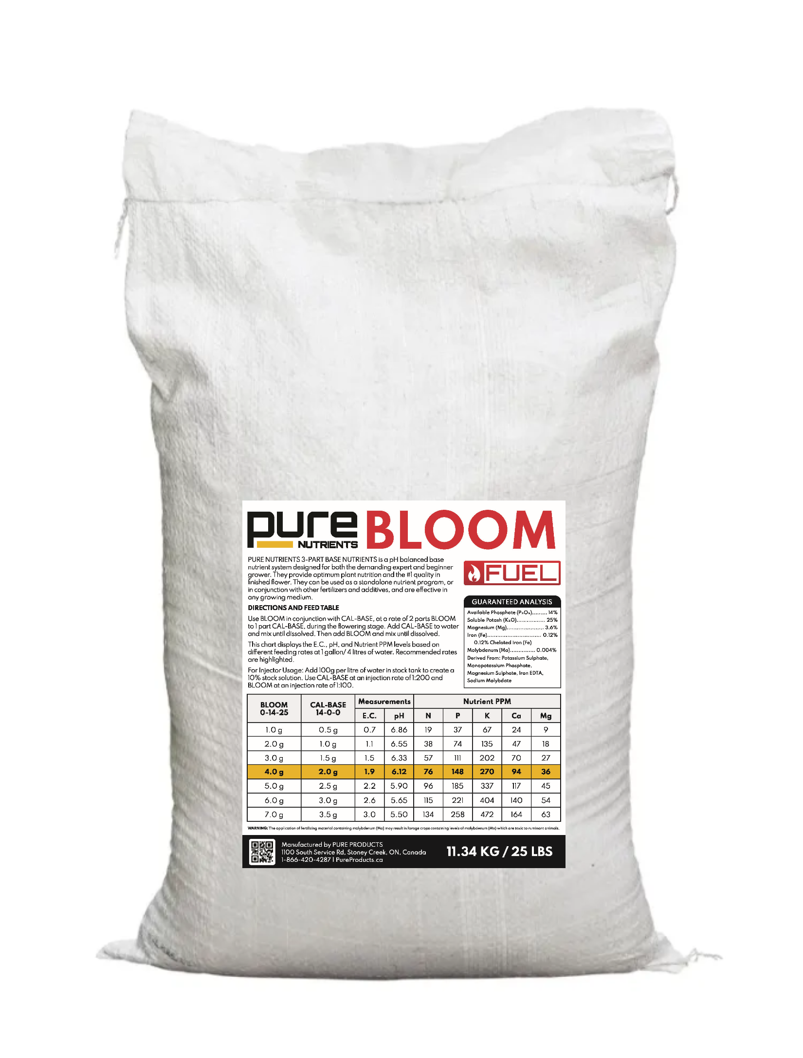 For Injector Usage: Add 100g of per liter of water in stock tank to create a 10% stock solution. Use CAL-BASE at an injection rate of 1:200 and BLOOM at an injection rate of 1:100.